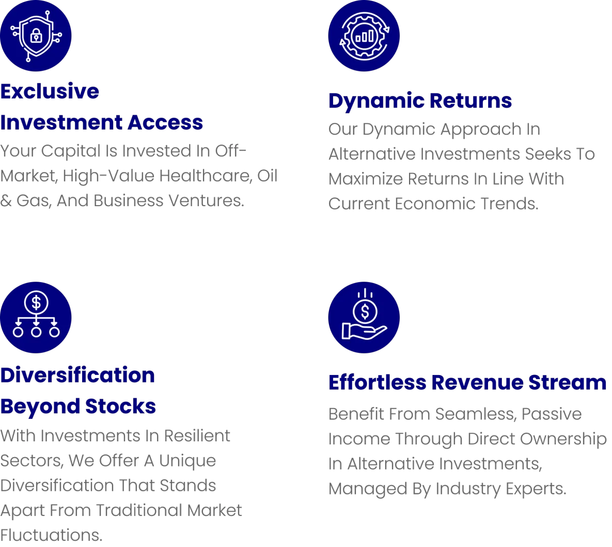 Prime Discoveries stands out due to our focus on exclusive and alternative investment opportunities in healthcare, oil & gas, and business ventures. We offer direct access to off-market deals and a personalized approach, ensuring our investments are not just profitable but also align with our clients' unique financial goals.